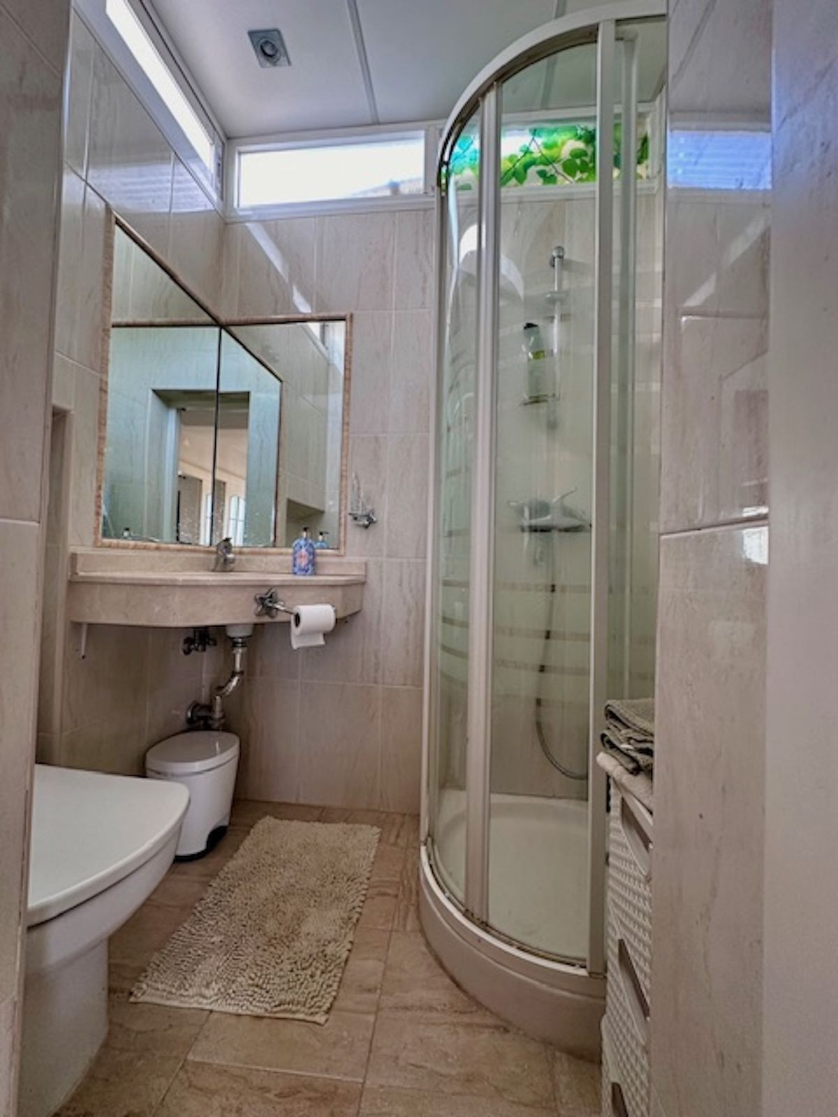 Spacious entrance hall, with a kitchen to the right overlooking the complex and exceptionally bright, with windows and natural light. The laundry area off the kitchen has been converted into a bedroom with a 90-cm bed. This makes it an option for an additional guest!