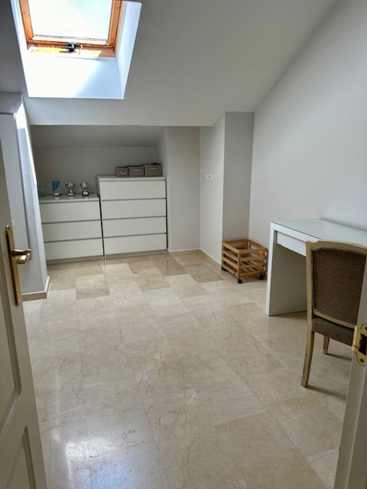 The living room has a guest bathroom and plenty of storage space, as all the stairwells have been closed off with wardrobes, maximizing the space.