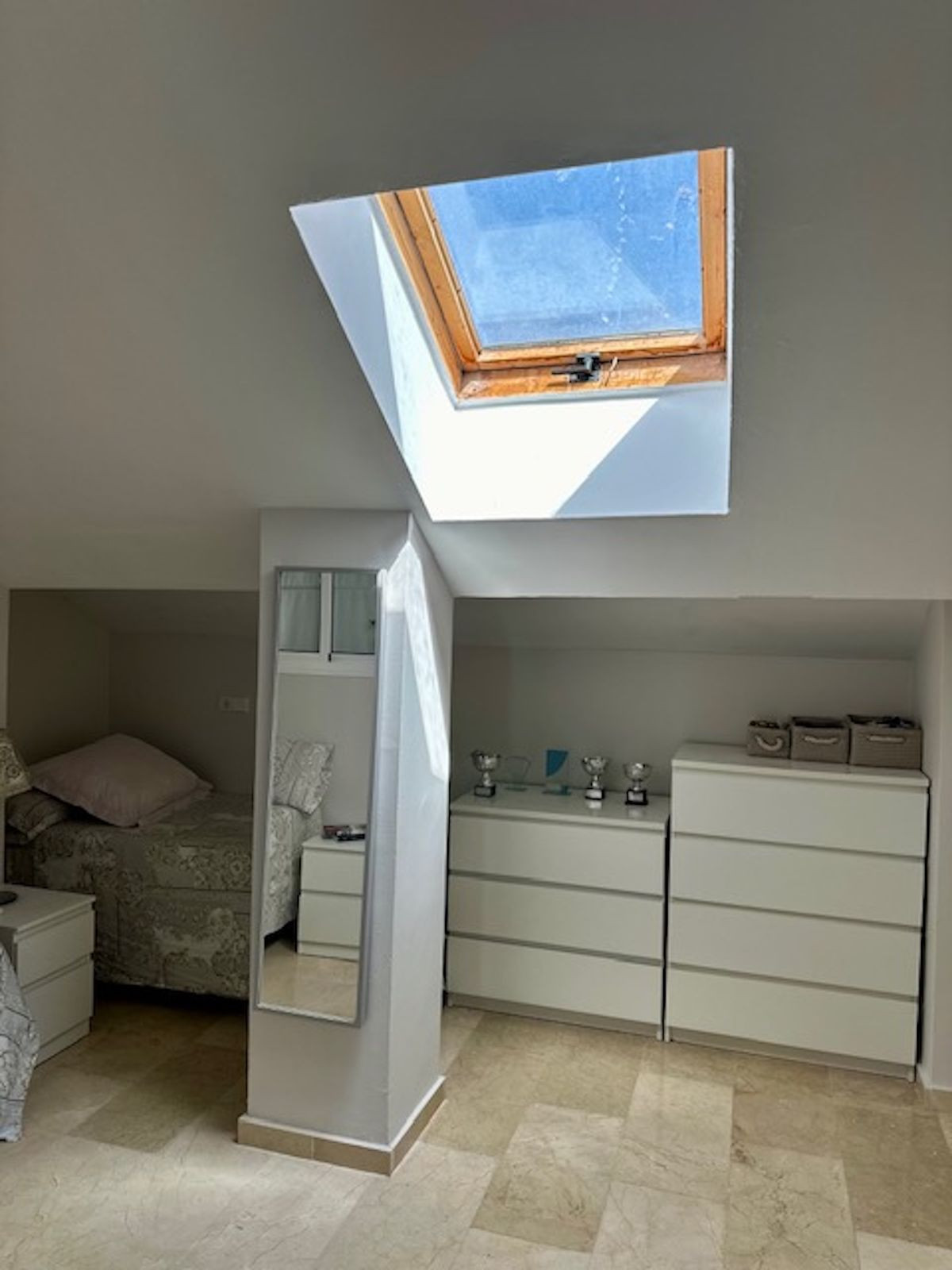 We go up the stairs to the first floor and find, on the left, a loft bedroom with incredible natural light, and two other spacious bedrooms with access to another terrace of the home, ideal for sunbathing due to its privacy. (This terrace could be added to the home if required). We have 2 full bathrooms for these 3 bedrooms on the upper floor.
