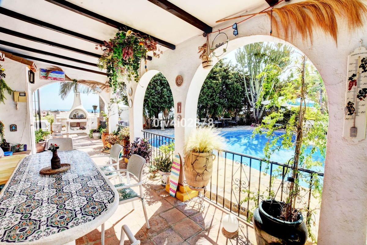 Nestled in an exceptional location that perfectly marries tranquil countryside living with the convenience of village life, this charming Andalusian-style villa is a true gem. Situated on a raised point with a serene, elevated position, the property offers stunning sea views towards Fuengirola, with the potential for panoramic views from various vantage points. The lush, mature trees and beautifully maintained bushes envelop the home, providing both privacy and a timeless character that is truly captivating.