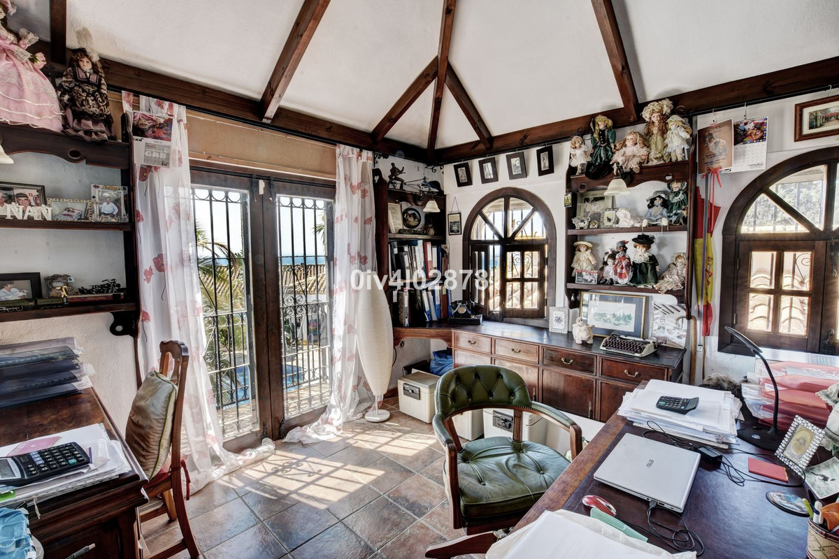 On entering the villa, you are greeted by a welcoming hallway that sets a tone of classic elegance. This space leads to the heart of the home, a large and spacious lounge centered around a charming fireplace, perfect for cozy evenings. The lounge provides access to two distinct terraces: one leading directly to the inviting swimming pool area, and the other featuring several intimate seating zones, all benefiting from the spectacular sea views. Adjacent to the lounge is a dedicated dining area, ideal for hosting guests. From here, a staircase ascends to a unique tower space, currently used as a private office, but with the flexibility to be converted into an additional bedroom. This tower room is a highlight, boasting a private balcony and multiple windows that frame beautiful, far-reaching vistas.