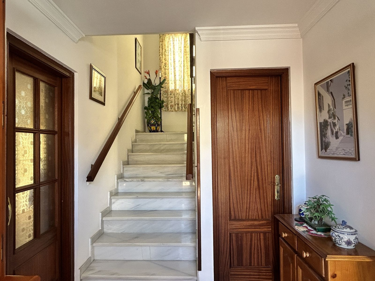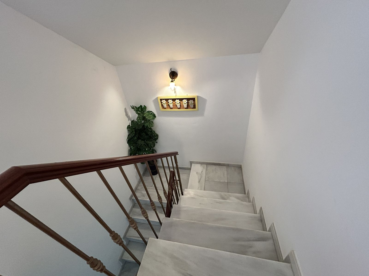 A spacious semi-detached house for sale located in the central area of Los Pacos, Fuengirola. The property has 4 bedrooms, 2 terraces, 3 bathrooms, a guest toilet, an entrance porch, an interior patio, and a private parking space.