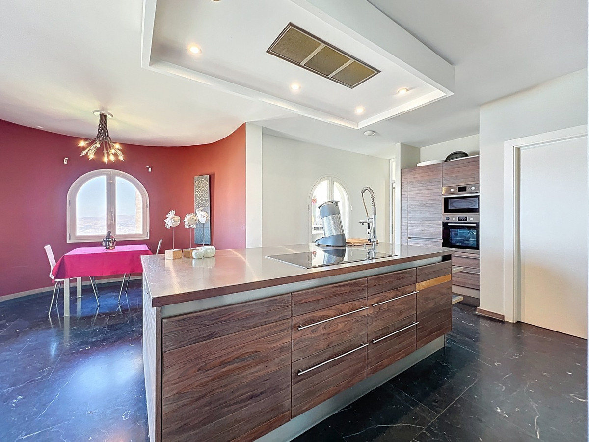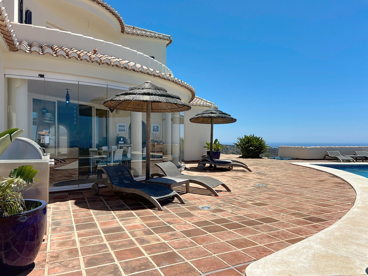 Imagine waking up each day to the soothing embrace of the Mediterranean in this exquisite villa. A true architectural masterpiece, this home offers an unparalleled lifestyle, seamlessly combining spacious interiors with awe-inspiring vistas that stretch all the way to the horizon. The living area welcomes you with an abundance of natural light, thanks to floor-to-ceiling sliding glass doors that perfectly frame the mesmerizing views of the azure sea. The open-plan design creates an ideal flow for both intimate gatherings and grand entertaining, blurring the lines between indoor luxury and outdoor paradise. For the culinary enthusiast, the gourmet kitchen is a dream come true, equipped with state-of-the-art appliances and ample space for creating memorable meals. Dine al fresco on the expansive terrace, where the gentle sea breeze enhances every moment. The lavish master suite, spanning 32.5 m2, offers a tranquil retreat with panoramic ocean views. Start your day in the spa-like bathroom, a true testament to luxury and comfort. The private balcony ideal for sipping morning coffee or enjoying an evening cocktail as you watch the sun dip into the sea. At the outside, the terracotta-tiled outdoor terrace is your personal oasis. Bask in the warm Spanish sun, host unforgettable parties, or simply lose yourself in the mesmerizing views of the coastline. Beyond the beauty, this villa offers a rare opportunity for those looking to start a business, like a B&B. With 4 rentable rooms, each with its own bathroom and entrance, the property has already been successfully operated as a B&B, receiving only glowing reviews. In addition to the rental rooms, theres a private bedroom on the first floor with its own bathroom, and another bedroom with a bathroom in the basement. The fully equipped kitchen inside and the wonderful outdoor kitchen provide all the necessary amenities for running a successful business, while the large underground garage offers plenty of space for storage. Located in Algarrobo, Málaga, this property ensures easy access to world-class amenities, pristine beaches, and rich cultural experiences, all while offering the perfect setting to indulge in Mediterranean living. Whether you're looking for a luxury family home, a business opportunity, or simply a slice of paradise, this villa delivers on every front. This is more than just a home; its a lifestyle. Embrace the pinnacle of Mediterranean living in this extraordinary villayour dream of owning a piece of paradise is now within reach. Dont miss the chance to elevate your life to new heights of luxury, beauty, and opportunity. We are pleased to be able to present this dream property to you soon, either personally or via virtual viewing. Because this world, it is unique - just like our Axarquía. In Andalusia. On the Costa del Sol. Here, on the sunny side of life...
