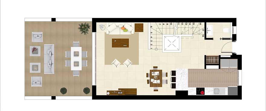 Horizonte Golf features luxury finishes, fully equipped furnished kitchens and installed air conditioning, designer bathrooms, bedrooms with motorized blinds, and secure, fully lined wardrobes. The area has three 18-hole golf courses, a hydrotherapy centre and Spa, a 4-star hotel, a golf school, 24-hour security and a variety of sports facilities, all surrounded by a fantastic natural environment. Only a few minutes' drive away you can enjoy the charm of Mijas and its well preserved old town of narrow streets, go shopping in Marbella or Fuengirola, or enjoy the nightlife in La Cala de Mijas and Puerto Banus.